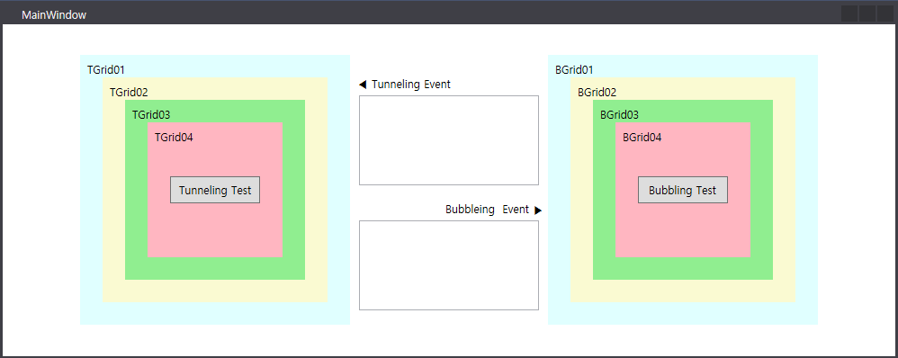 - 좌측 버튼(Tunneling Test) 클릭, 최상위 요소(TGrid01)부터 이벤트 발생 요소(Button) 순서로 이벤트 발생