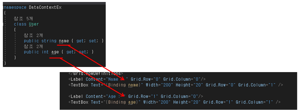 · MainWindow의 DataContext 속성에 User Class로 생성한 객체 할당