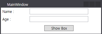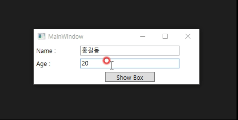 · 버튼 클릭, Binding된 user 객체의 name, age 정보를 MessageBox로 출력