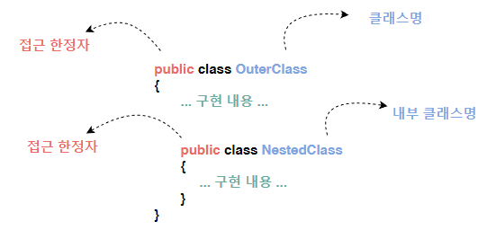 클래스 내부에 정의하는 클래스로 정의 방법에 따라서 클래스의 그룹화가 가능하고 접근 한정자(Access Modifier)를 사용하여 클래스 사용 범위를 내부로만 제한하여 관리할 수 있습니다.