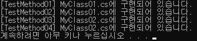 Console.WriteLine($"[TestMethod01] MyClass01.cs에 구현되어 있습니다.");
