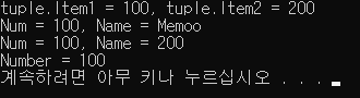 Console.WriteLine($"Num = {tuple02.Num}, Name = {tuple02.Name}");