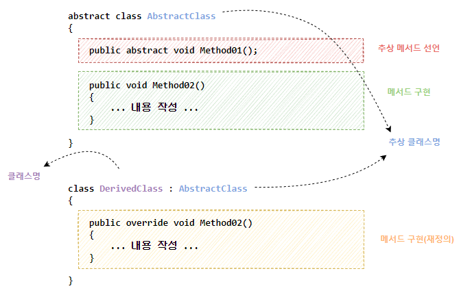 · 추상 클래스의 파생 클래스는 추상 메서드(AbstractMethod)를 구현해야 함