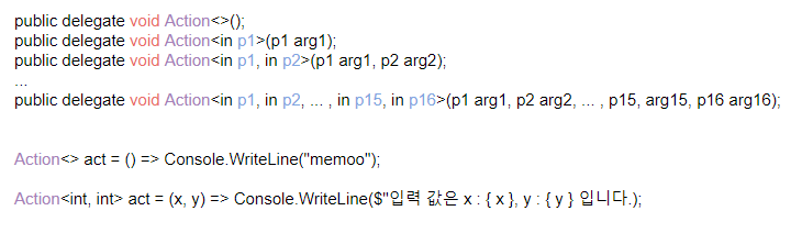 Action<int, int> act2 = (x, y) => Console.WriteLine($"x : {x}, y : {y} 입니다.");